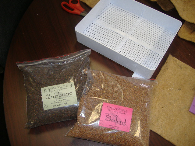 I bought a bulk roll of the baby blanket soil-less growing medium and just cut it to the size of the growing containers. After you have soaked your seeds overnight just simply pour the soaked seeds onto the growing medium lined sprouting container and cover with the lids provided. Keep the seed covered for the first couple of days making sure you rinse the seeds daily with cool water and spray with an organic fertilizer. I use SeaCom – organic seaweed concentrate.
