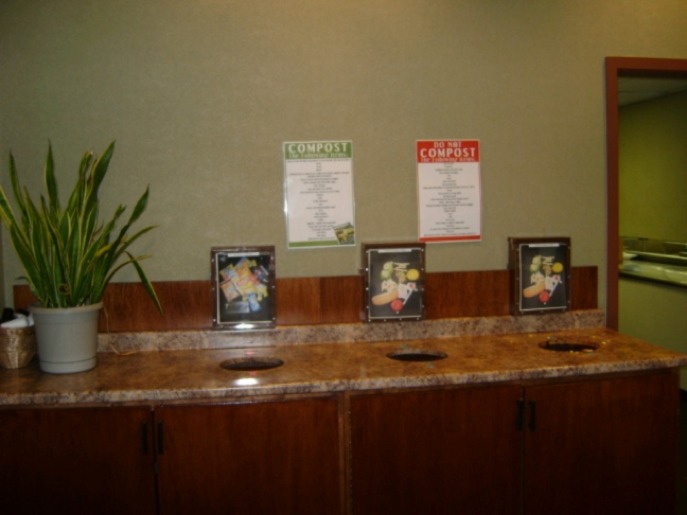 Here at Parkhurst Dining Services at Chatham University, we are always searching for ways to lessen our carbon footprint and reduce the amount of waste that ends up in landfills. Four years ago we started a before and after consumer composting program in our main dining hall. Both our staff and students were concerned about the extra steps that it would take to deal with the garbage. To make things easier, we purchased garbage cans and liners in different colors for each kind of waste: yellow for compostable, blue for recyclable and black for trash. In the dining hall we have a station that explains what is and is not compostable and in the back of the house we have explanatory posters.