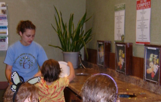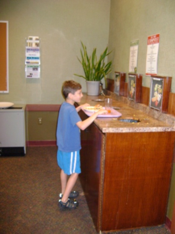 First we had to explain why. For the little ones, we explain that the extra food and paper goods from their lunches gets turned into food for the trees, shrubs and gardens that they see around them on campus. We don’t get too technical and only answer the questions that they ask. Actually, this also works for the older ones since for the most part they have learned about this in some form in school and start out with a better understanding. With them, if they ask, we explain more fully about how the food is picked up by an external composter (AgRecycle) and the process of composting. For the most part, the tweens and teens aren’t really that interested and just follow the plan because that is what they are supposed to do.