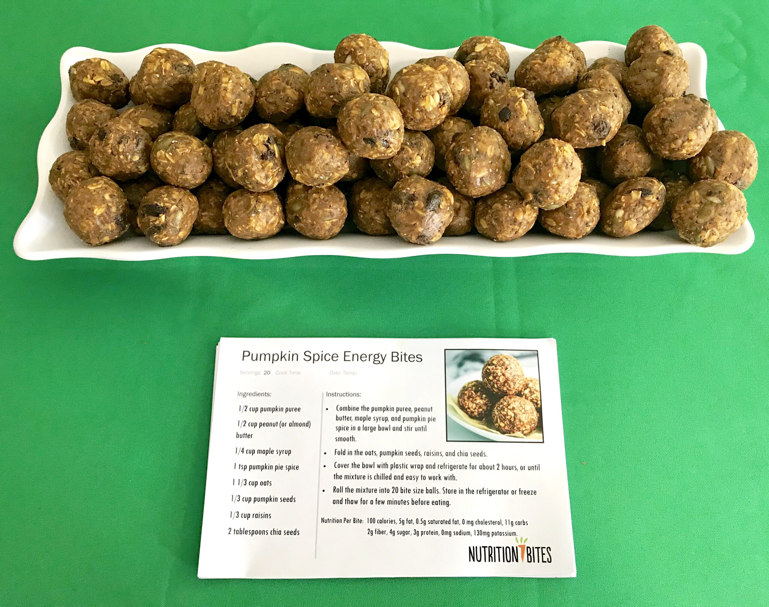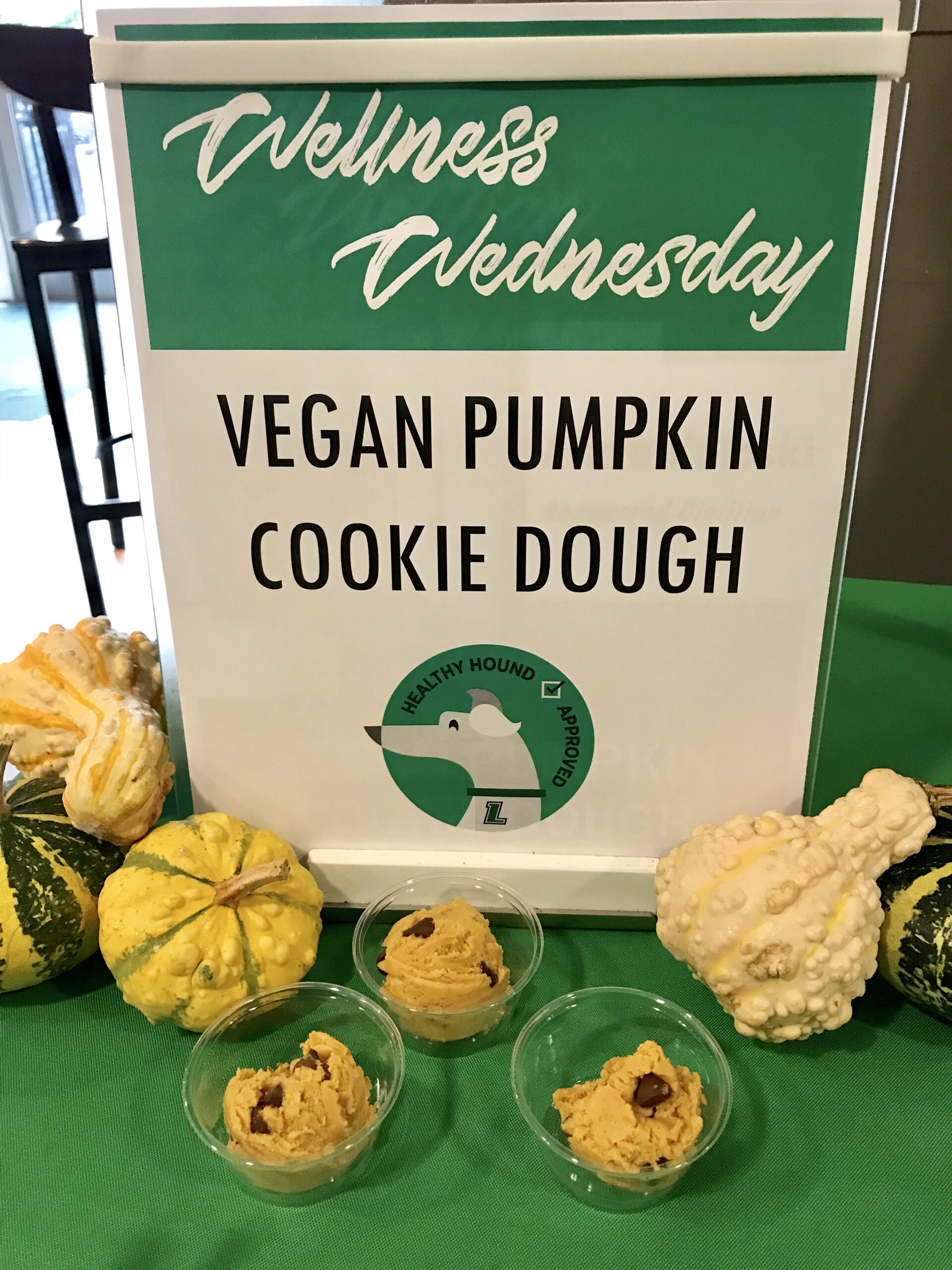 Two healthy treats, Vegan Pumpkin Cookie Dough and Pumpkin Spice Energy Bites, were served on campus, in Boulder Garden Cafe and the Fitness and Aquatic Center, respectively. Unsurprisingly – it is October, after all – these pumpkin delights were a huge hit! Lots of students stopped by to try them out, and were excited to discover that both recipes were no-bake, and required relatively basic ingredients.