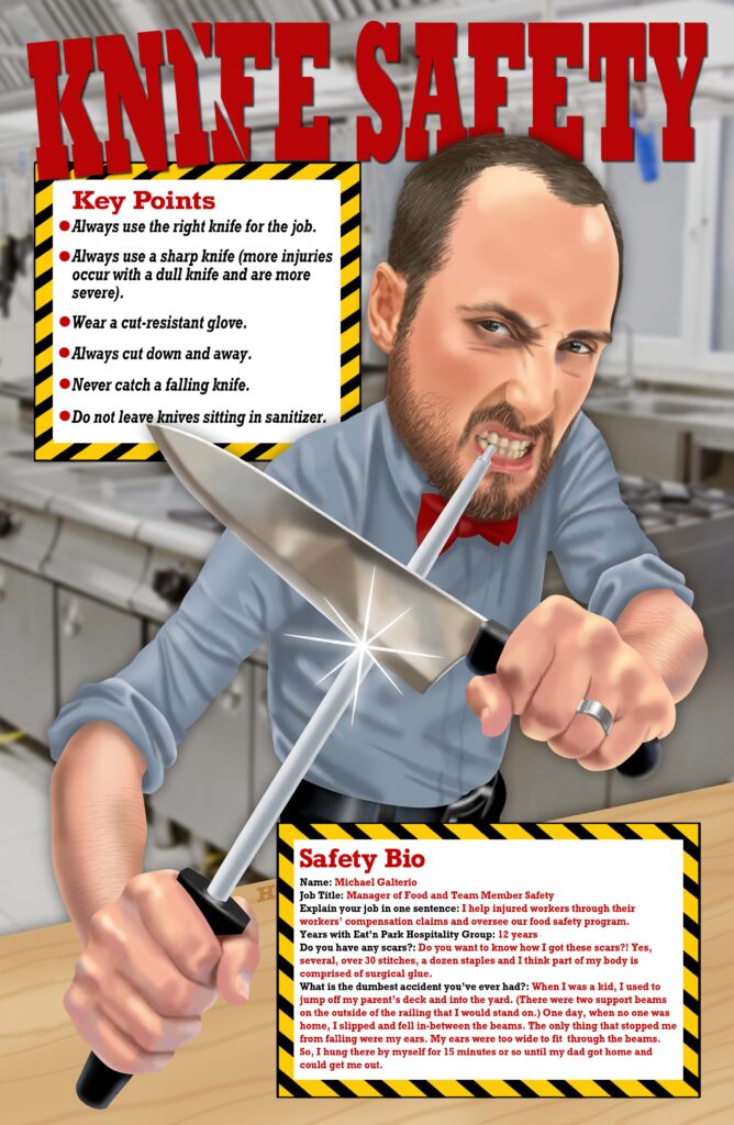 These custom food safety posters are placed in our kitchen environments and feature illustrations of our very own Mike Galterio (pictured) and Erik Schlaich in comic book style. They grab your attention and are memorable compared to standard issue safety posters.