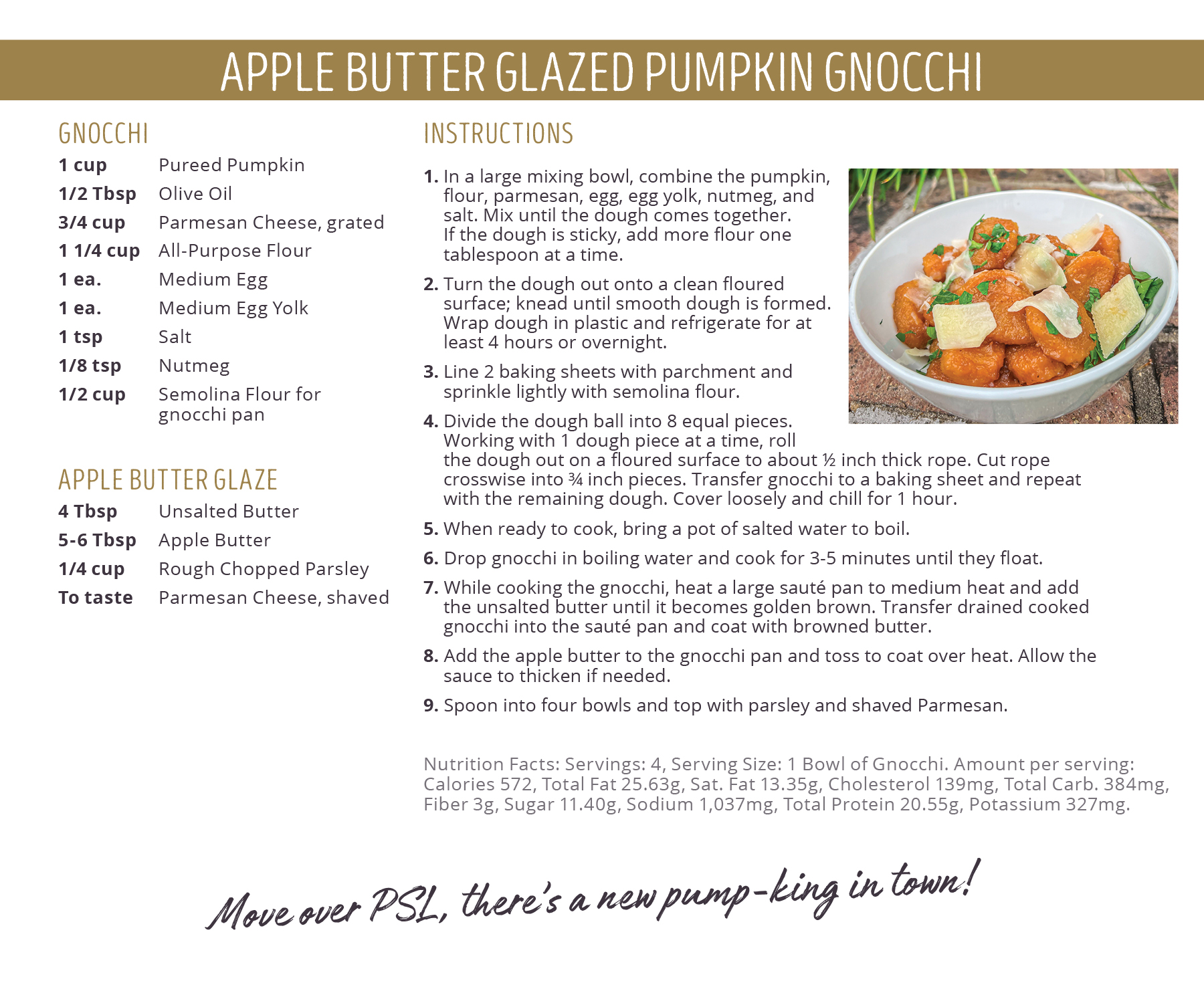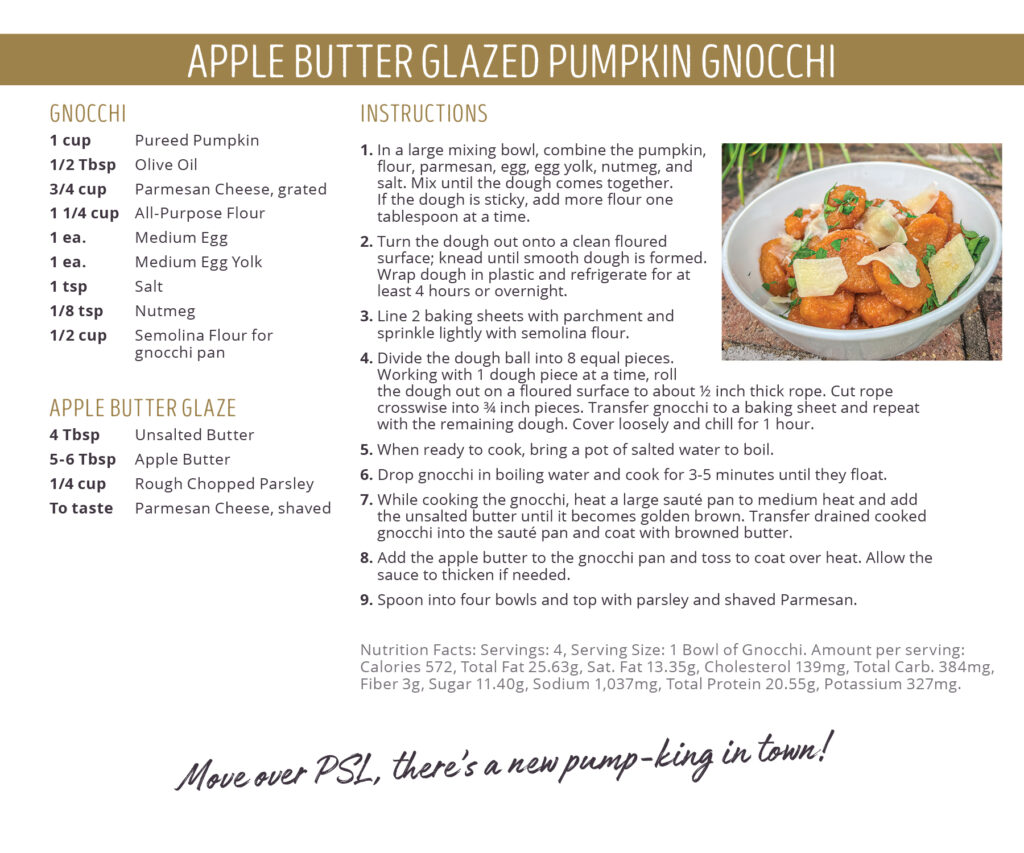 “These apple butter glazed gnocchi make a tremendous seasonal vegetarian entreé or side dish, combining the sweet apple butter and the savory pumpkin.” says Chef Jacob Smith from Bard College. “It tastes like fall!”