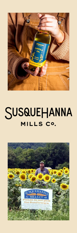 In 2006, Susquehanna Mills founder Josh Leidhecker started using waste vegetable oil (WVO) from restaurants to produce biodiesel, in a process of farm-to-fork-to-fuel. Soon, he began to produce high-quality sunflower and canola oil from locally grown crops and collaborated closely with farmers to grow seed oil crops, which are then pressed into high-quality oil delivered to commercial kitchens, distributors, and retail partners. Susquehanna Mills practices Full Circle manufacturing, meaning that they work with farmers to create the oil, sell the oil to restaurants, and then repurpose the WVO to power farming equipment, creating a sustainable and efficient cycle.