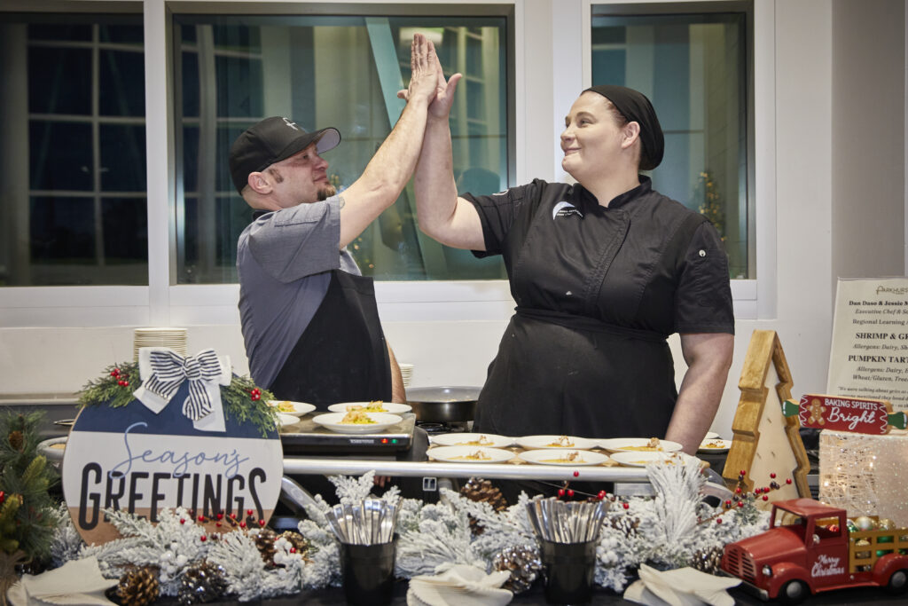 Dan Daso and Jessie McKivigan from Regional Learning Alliance high five during the Family Meal event where they presented Shrimp & Grits and a Pumpkin Tartlet.